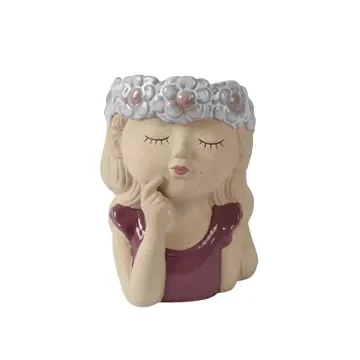 Deze bloempot in de vorm van een vrouwengezicht is een echte blikvanger! Met haar zachte roze-witte kleuren en speelse design brengt ze karakter en charme in elke kamer. De keramieken pot heeft een hoogte van 15,7 cm en is perfect voor kamerplanten zoals vetplanten, kleine bloemen of siergrasjes. Zet haar op een vensterbank, kast of bureau en laat haar je interieur opfleuren!