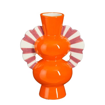 Deze vaas heeft een elegante, moderne uitstraling in een levendige oranje kleur, perfect voor het toevoegen van kleur en stijl aan elke ruimte. De Cleo vaas is ideaal voor het plaatsen van bloemen of als decoratief object.